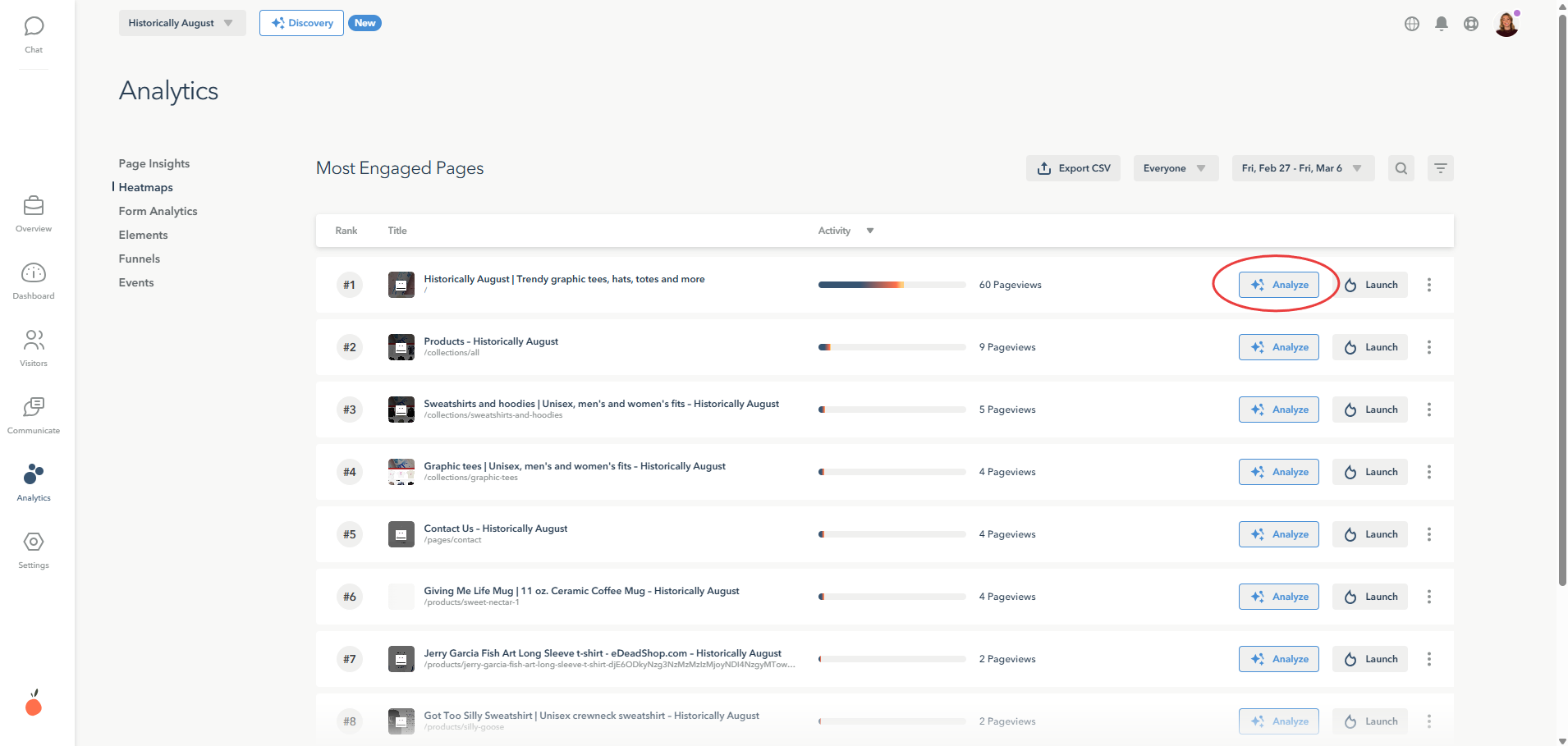 The Analyze button on Most Engaged Pages opens the Discovery AI chat window and will provide a text-based summary of your heatmap data for that page.