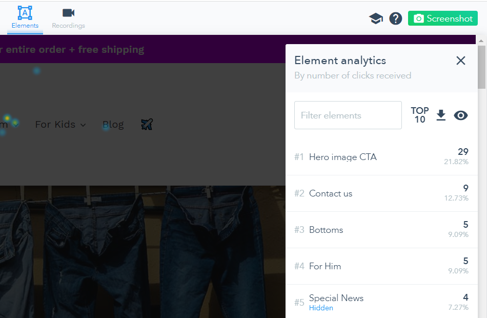 If you hover over an element, you’ll also see that element’s popularity displayed by the percentage of clicks or taps it received out of all the elements on a page.
