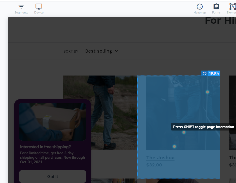 Hovering over an element on the heatmap will show you the element's engagement ranking compared to other elements on the page as well as the percentage of clicks based on total page interactions. If the element ranking isn't displayed, press SHIFT on your keyboard to enable it.